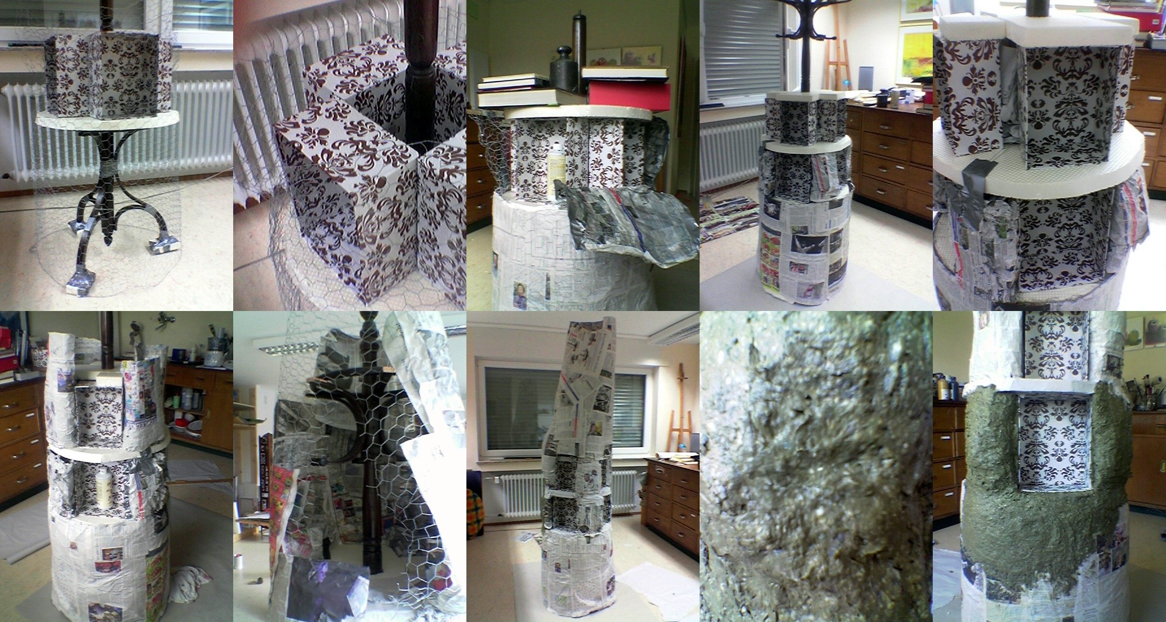Für die Umsetzung meines Projekts "Geheimen Baumbotschaften" waren viele Arbeitsschritte mit unterschiedlichen Materialien und Techniken notwendig. Dementsprechend intensiv arbeitete ich mehrere Monate daran.Für den Baum: hölzerner Kleiderständer, Draht, Pappschuber, Styrodurplatten, Zeitungen, Kleister, Putzlappen als Aststümpfe