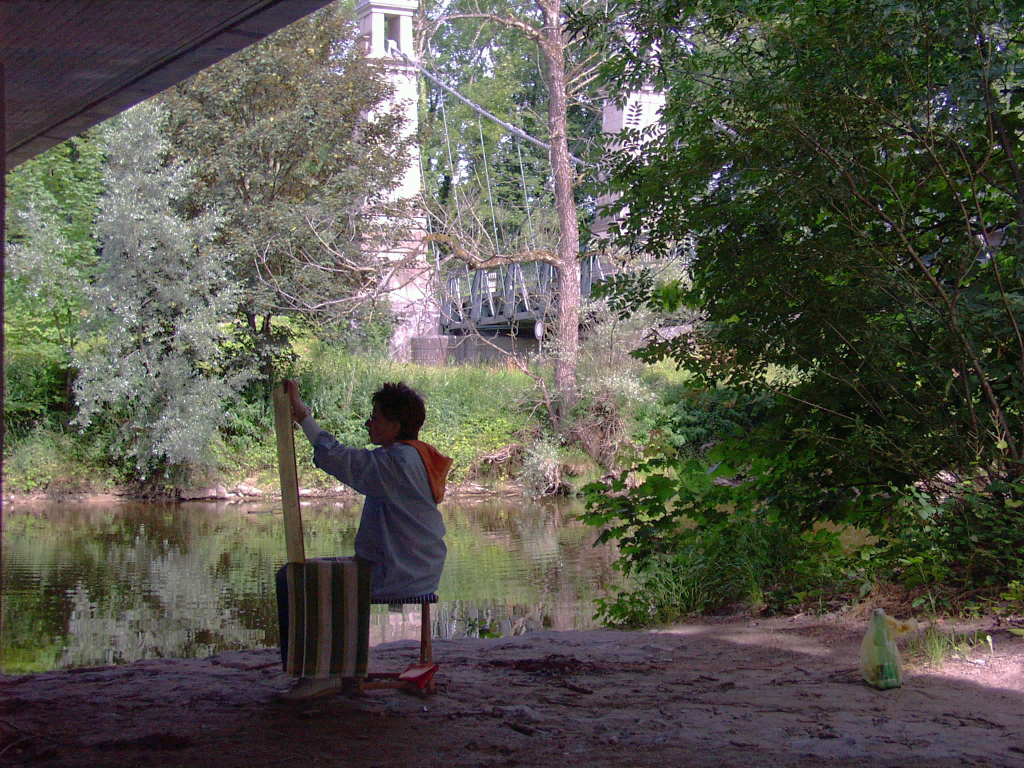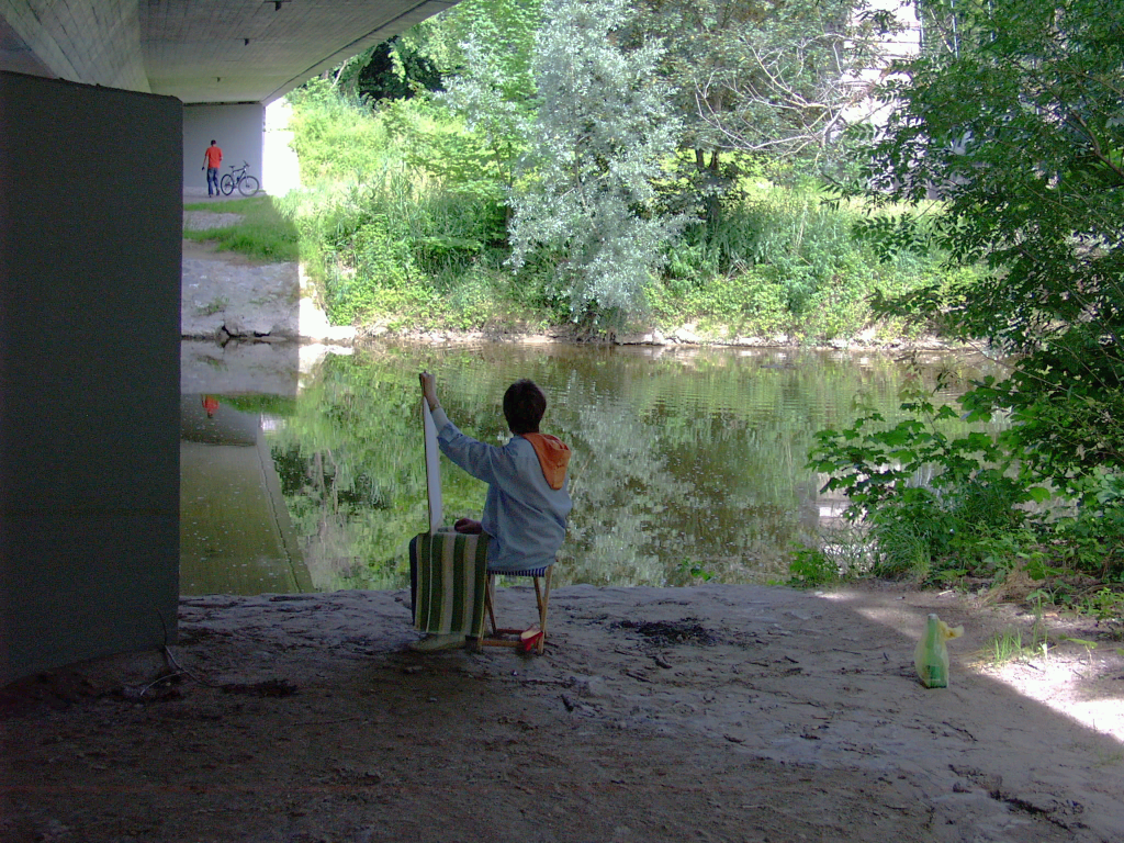 Trotz des Autoverkehrs genoss ich die ruhige Stimmung, unter einer Brücke sitzend, um Deutschlands drittälteste Kabelhängebrücke, zwischen Kressbronn und Langenargen, malerisch festzuhalten.