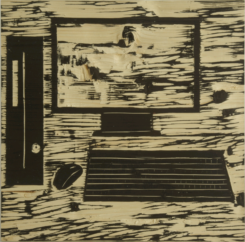 Die Künstlerin verwendet zu ihrer Aussage u.a. die Symbolik des Holzschnitts.