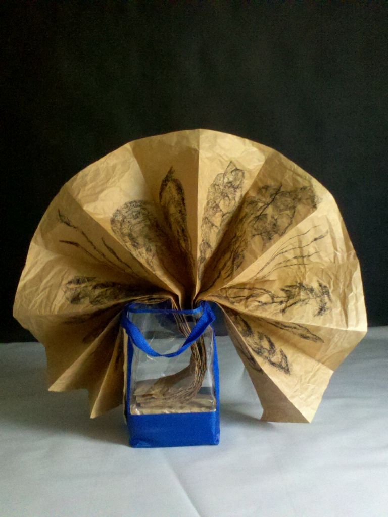 Aber nicht nur der Baum ist der Begleiter des Menschen, sondern auch die Taschen. Ich habe in die Taschen gepackt: Holzscheite, gezeichnete Bäume auf Packpapier, Zapfen, Papierschnipsel