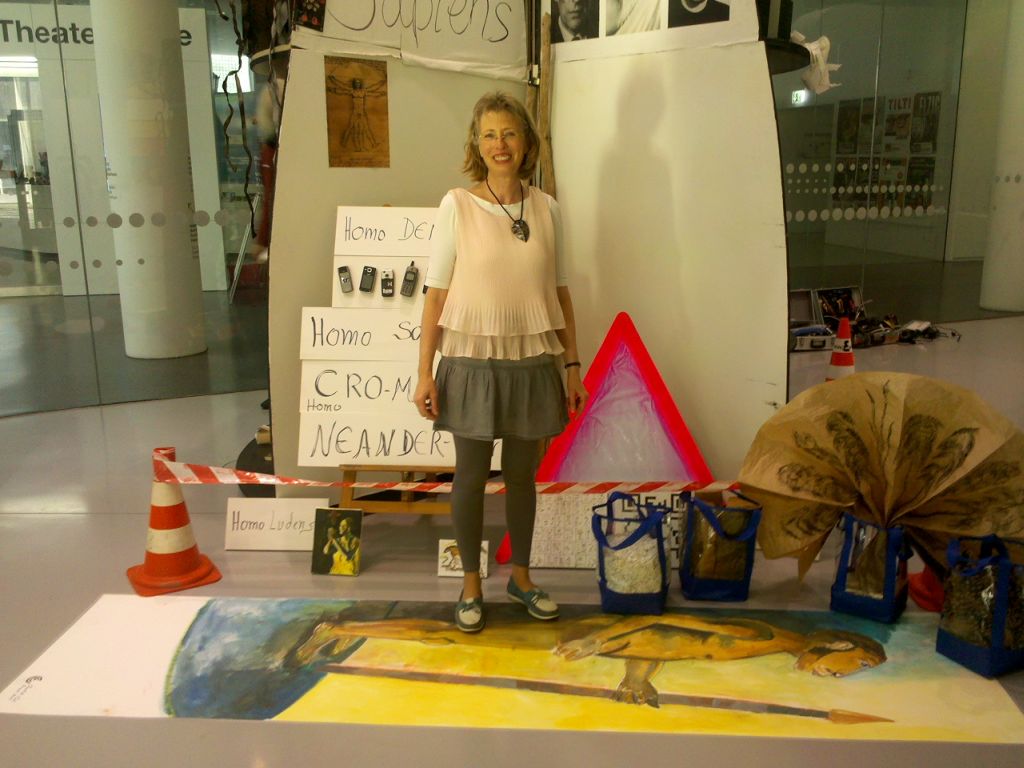 Mary Bauermeister hatte sich zuvor einen gemalten Neandertaler gewünscht, den ich ihr zu/an diesem Termin zeigte. Sie meinte super - bitte laminieren lassen - den legen wir auf den Boden.